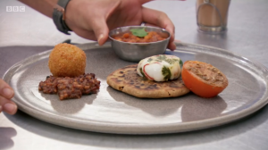 Another divisive issue for some viewers was why the complex mix of spices used by Nisha in her sausage and black pudding-stuff paratha topped with a chilli and coriander poached egg, masala baked beans and a pakora filled with garlic and mushroom hash brown with bacon jam and a grilled tomato wasn’t considered as ‘deviating from the brief’.